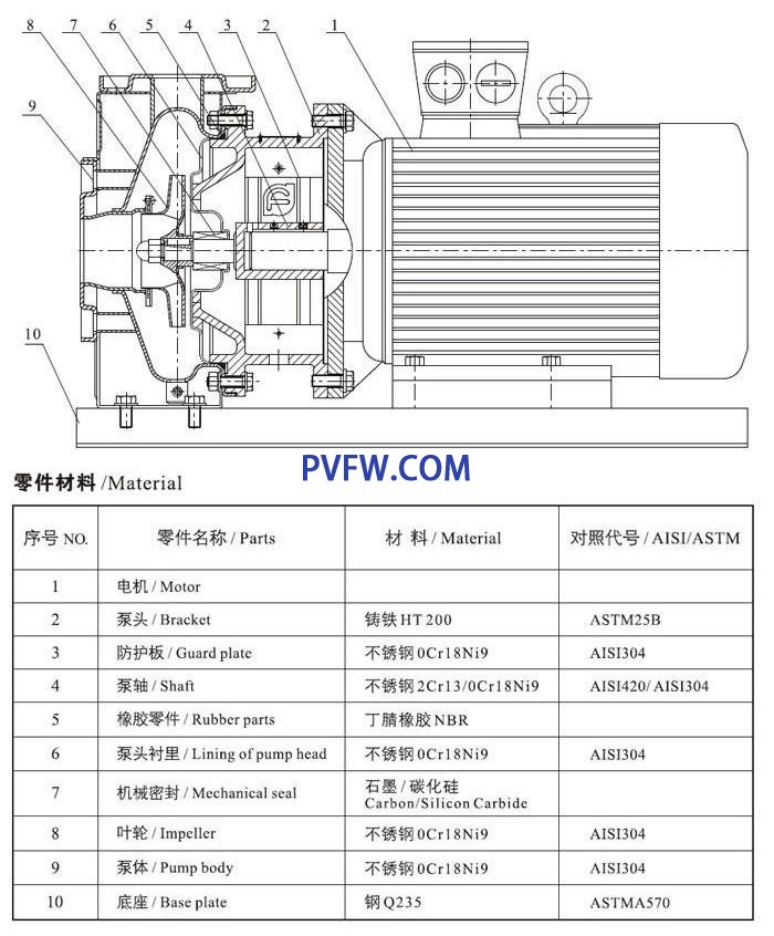 4 | 泵轴/Shaft | 不锈钢2Cr13/0Cr18Ni9 | AISI420/AISI304 |