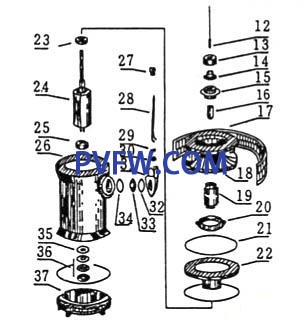 6、潜水泵的叶轮,整件密封盒,尼龙轴承座,不锈钢轴套橡皎扩张件,护套、等一些易损另部件,以及各种"O"型橡胶封环,加油螺孔上的橡胶衬垫等可向当地农机部门联系或向本厂销售科函购。